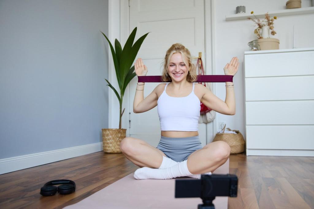 Para empuje, usa flexiones con variaciones, fondos entre sillas y elevaciones laterales con bandas. En tirón, practica remos con mochila, dominadas asistidas o con puerta segura. Pierna combina búlgaras, zancadas y bisagras de cadera. Ajusta volumen y comenta qué variaciones te funcionan mejor.